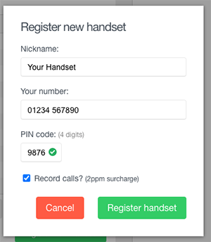 To record calls made from Dial Through, you can enable Call Recording when you register or edit a registered handset. Uncheck the box to disable recording.