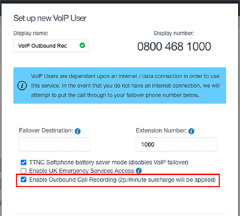 If you're looking to record calls made from your VoIP User, you can enable Call Recording when creating or editing your VoIP User.
