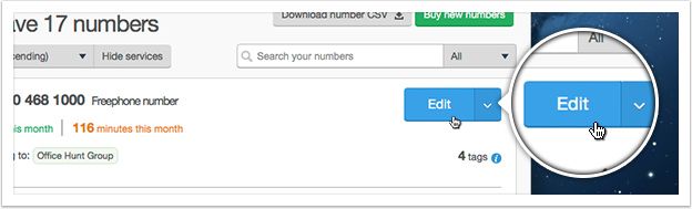 - Click on the Edit button on the number you want to setup Call Whisper.