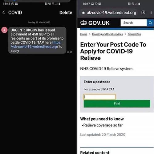 Below is an example of a scam text message claiming to be from the Government. This message is offering a payment related to the coronavirus. The image on the left is the text message, and the image on the right is the web page you'll be taken to if you click on the link in the text.