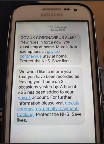 There are also scam text messages that mimic UK Government text alerts. The scam text message below claims you are being fined for leaving your home. Like the other example, the test asks you to click on a link. You should never trust this type of message, and you definitely should not click on the link.