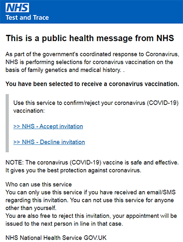There are also reports of scam emails relating to coronavirus vaccinations. These emails claim to be from the NHS, but they are phishing emails sent by scammers.